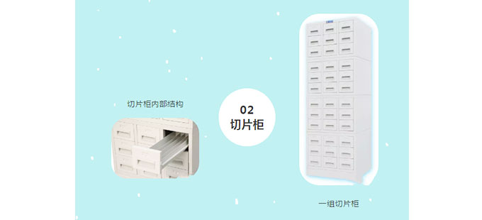 臘塊柜內部結構:一組臘塊柜2、切片柜:規格為480*515*1520mm,每套4組合,每組合9個抽屜,共36個抽屜,約放切片5.5~6萬片。